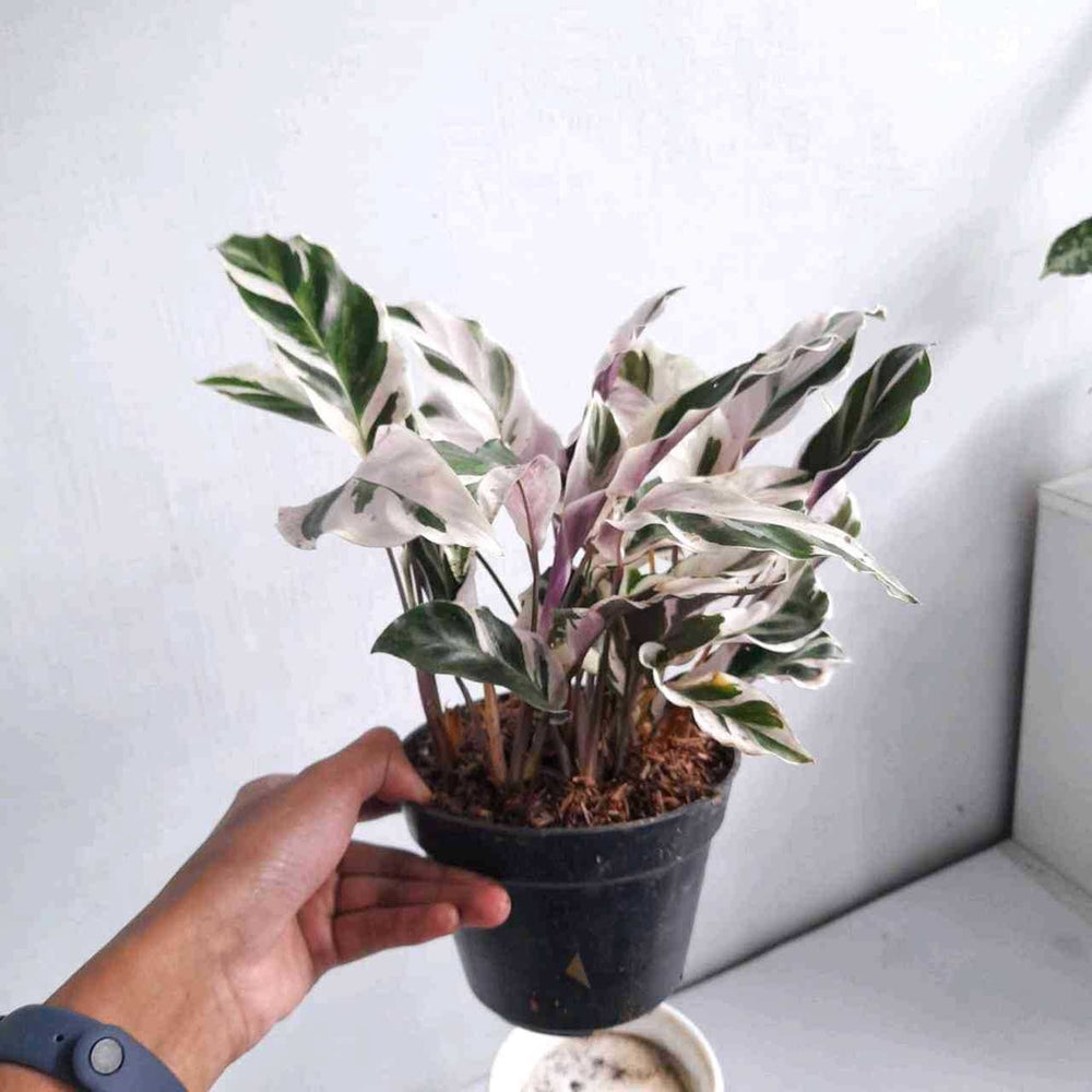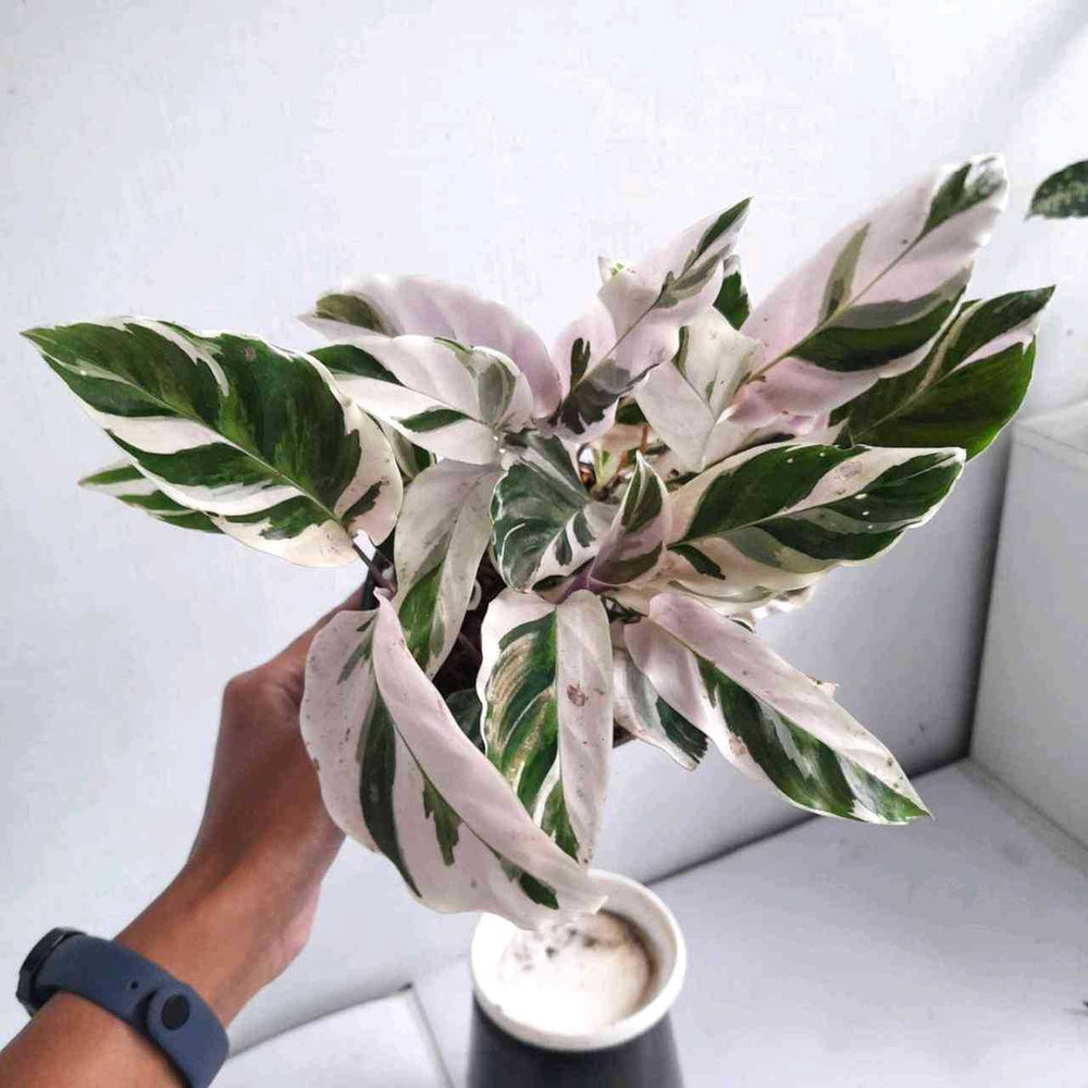 - Striking Variegated Leaves The Calathea White Fusion boasts breathtaking foliage adorned with a mesmerizing blend of white, green, and pink. The intricate patterns and contrasting colors create a visual masterpiece, making it a true statement piece in any room.