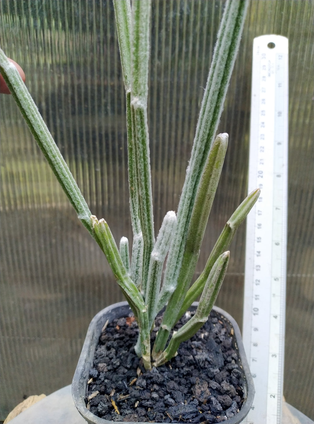 Seyrigia humbertii ‘Snow Stick’ is a rare and eye-catching succulent native to Madagascar, prized for its architectural form and distinctive, snow-dusted appearance. Its slender, upright stems make it an exceptional choice for collectors and for adding a touch of elegance to modern indoor or outdoor plant arrangements.